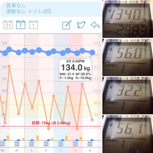 14:00 起床 14:00おはようございます。 1回目の体重測定 #ソイエット #おはようございます #体重 #体脂肪率 #水分量 #筋肉量 #グラフ #体重測定
