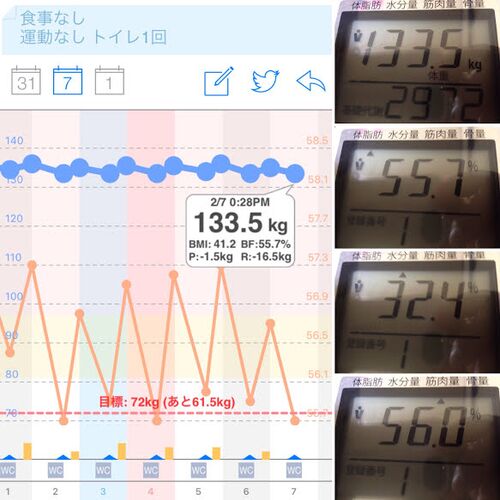 10:00 起床 10:00おはようございます。 1回目の体重測定 #ソイエット #おはようございます #体重 #体脂肪率 #水分量 #筋肉量 #グラフ #体重測定
