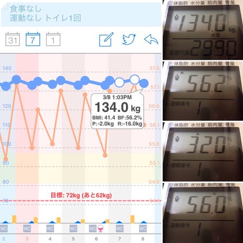 日々の起床・就寝時間、体重・体脂肪率測定、食事回数、食事内容を記録しています。