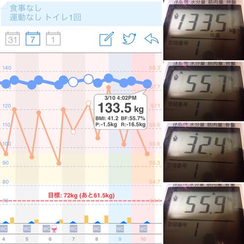 日々の起床・就寝時間、体重・体脂肪率測定、食事回数、食事内容を記録しています。
