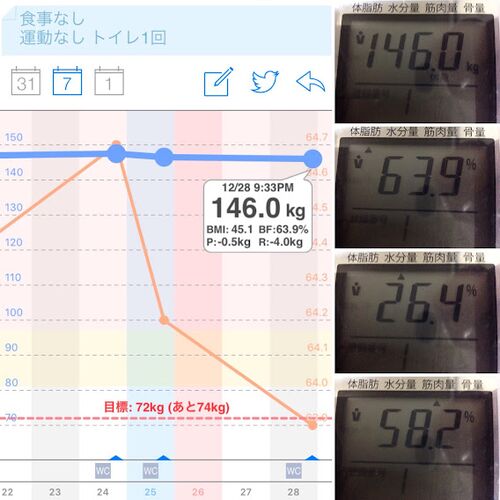 日々の起床・就寝時間、体重・体脂肪率測定、食事回数、食事内容を記録しています。