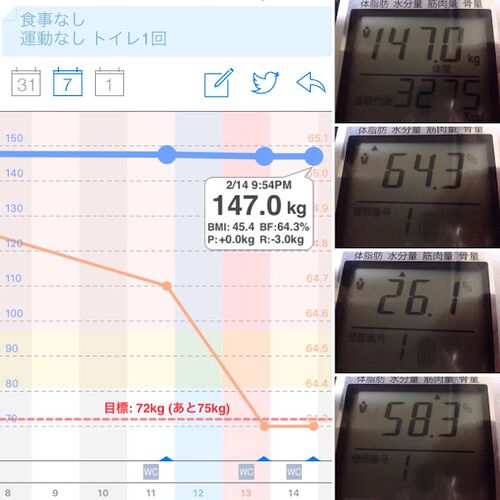 日々の起床・就寝時間、体重・体脂肪率測定、食事回数、食事内容を記録しています。