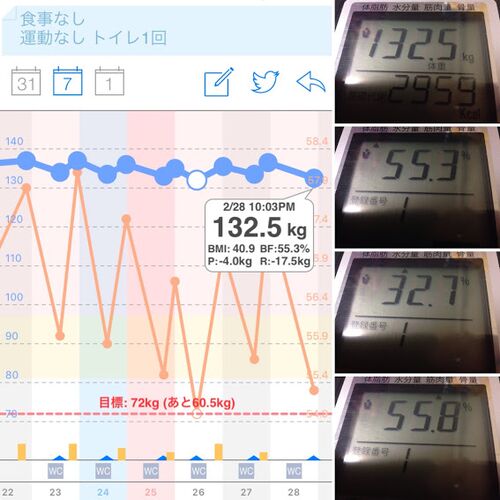 11:30 起床 14:40 1回目の体重測定 11:30 起床14:401回目の体重測定 #ソイエット #起床 #おはようございます #体重 #体脂肪率 #水分量 #筋肉量 #グラフ #体重測定 #記録
