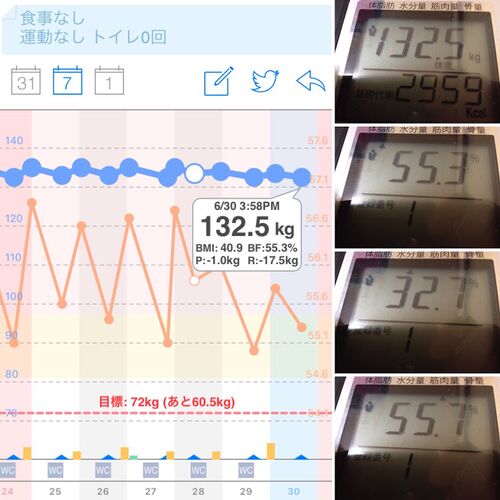 日々の起床・就寝時間、体重・体脂肪率測定、食事回数、食事内容を記録しています。